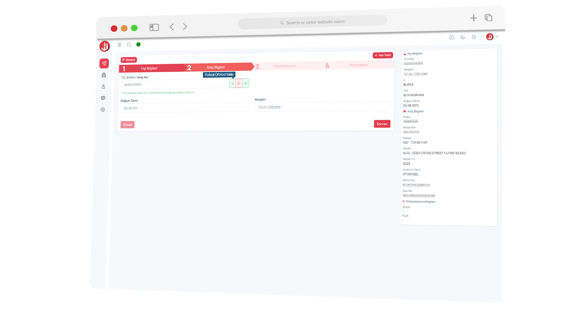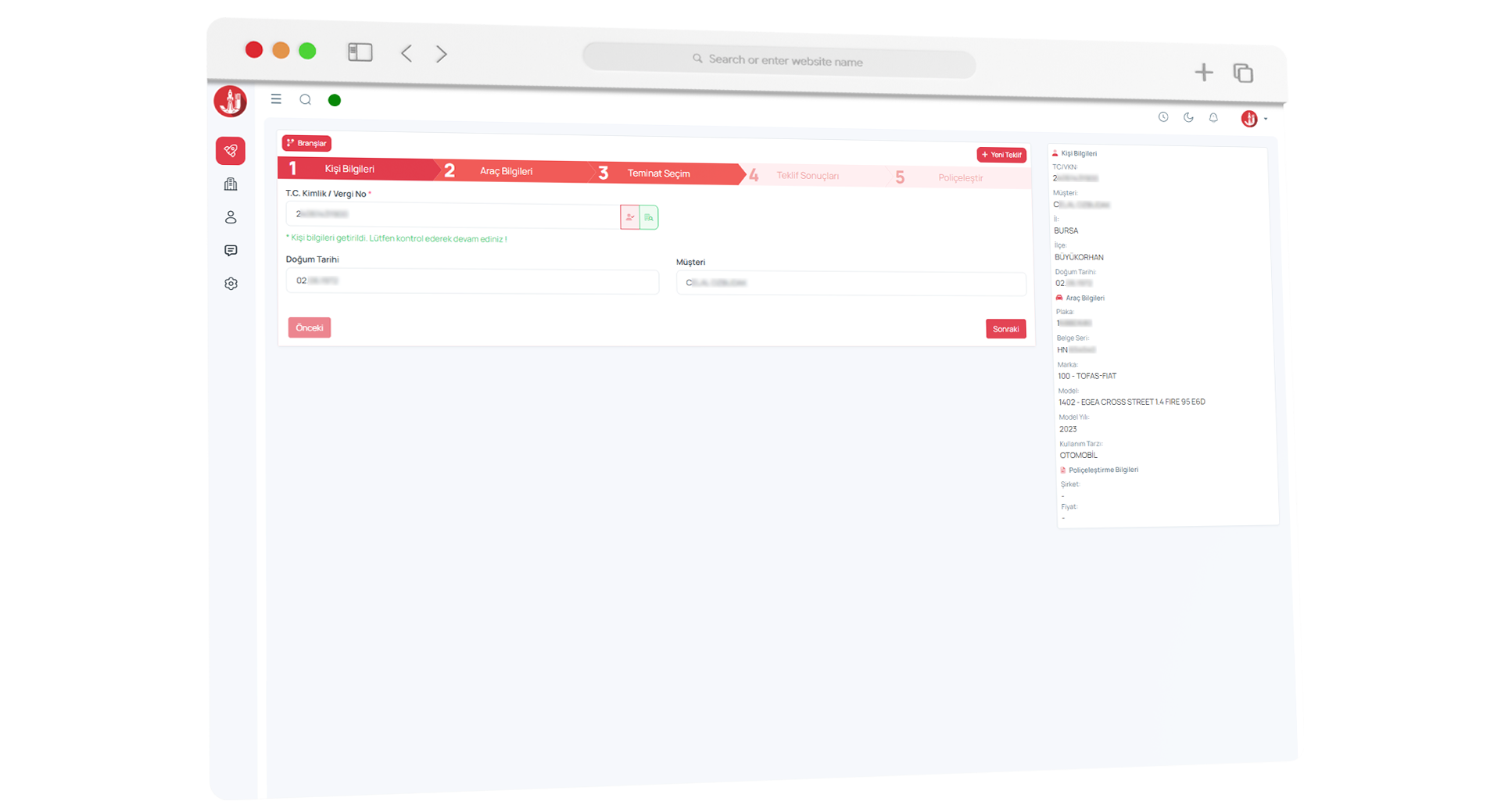 T.C. kimlik numarası sisteme girildiğinde, müşterinin ad, soyad ve doğum tarihi bilgileri merkezi veri tabanından otomatik olarak çekilir. Böylece manuel veri girişi ihtiyacı ortadan kalkar; süreç hızlanır ve hata payı minimuma indirilir.