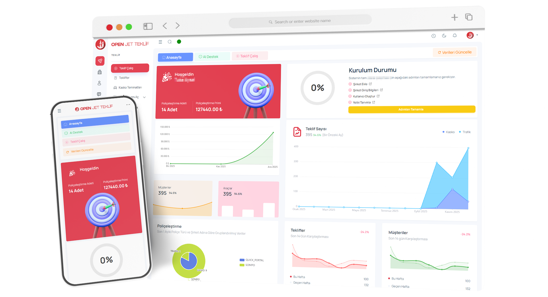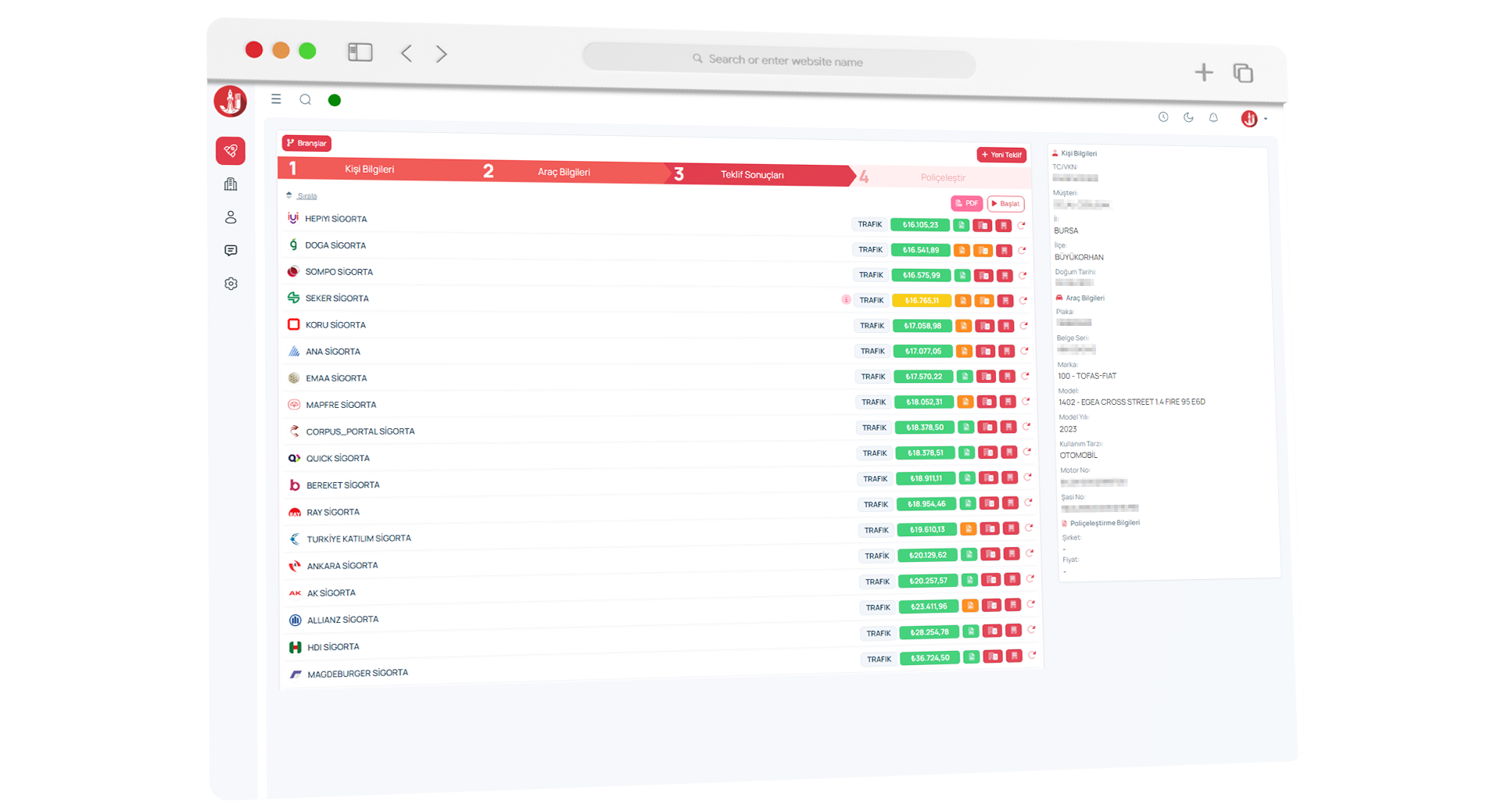 Trafik ve Kasko sigortası tekliflerini saniyeler içinde oluşturmanıza olanak tanırken, "Son Teklifler" listesi sayesinde geçmiş çalışmalarınızı ve müşteri verilerinizi anlık olarak takip etmenizi sağlar.