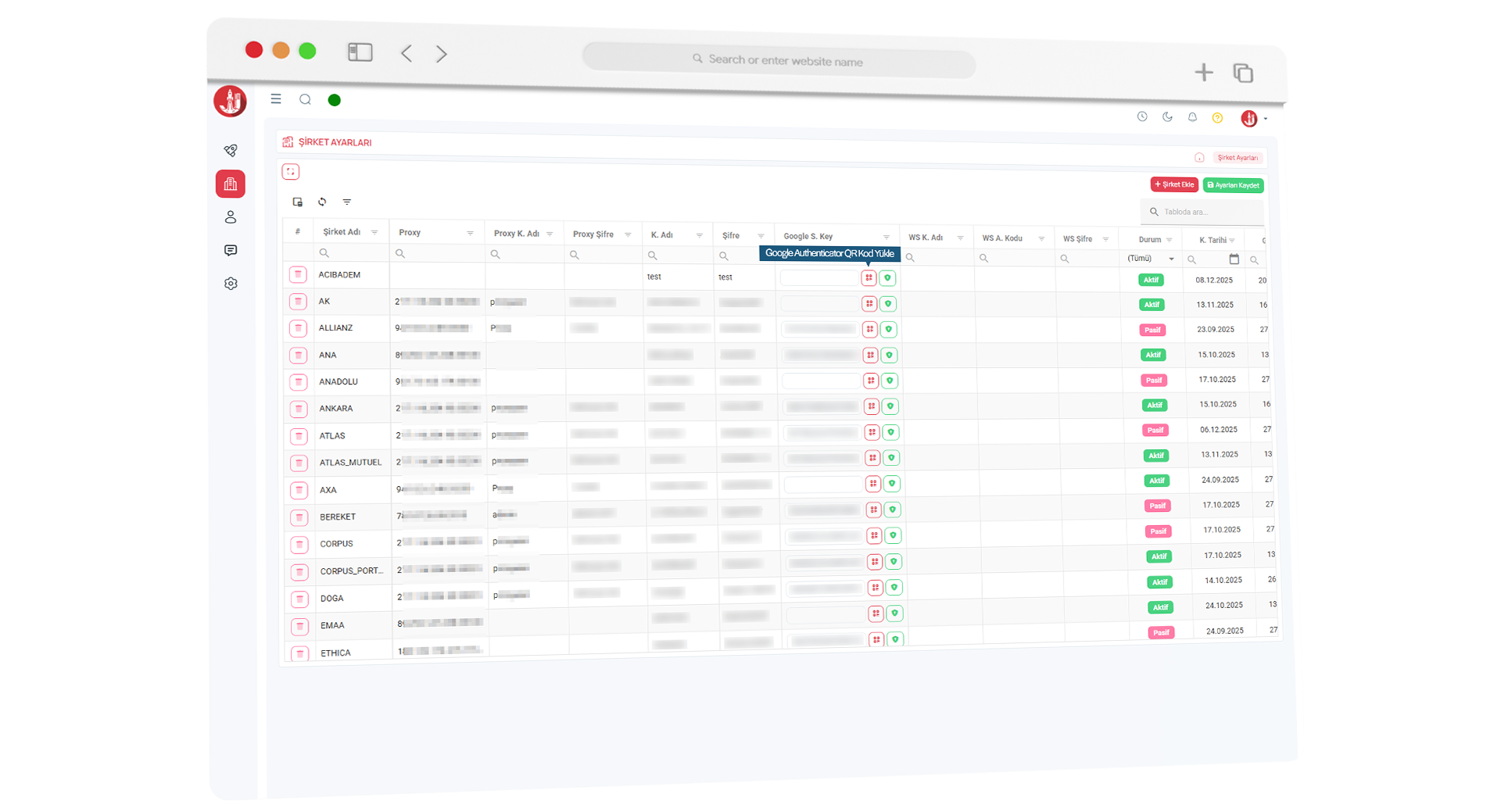 Her sigorta şirketi için kullanıcı adı, şifre ve Proxy bilgilerini personel bazlı tanımlayabilir; QR Kod Tanımlama (2FA) entegrasyonu ile şirket port allarına girişteki iki faktörlü doğrulama süreçlerini sistem üzerinden güvenle yönetebilirsiniz