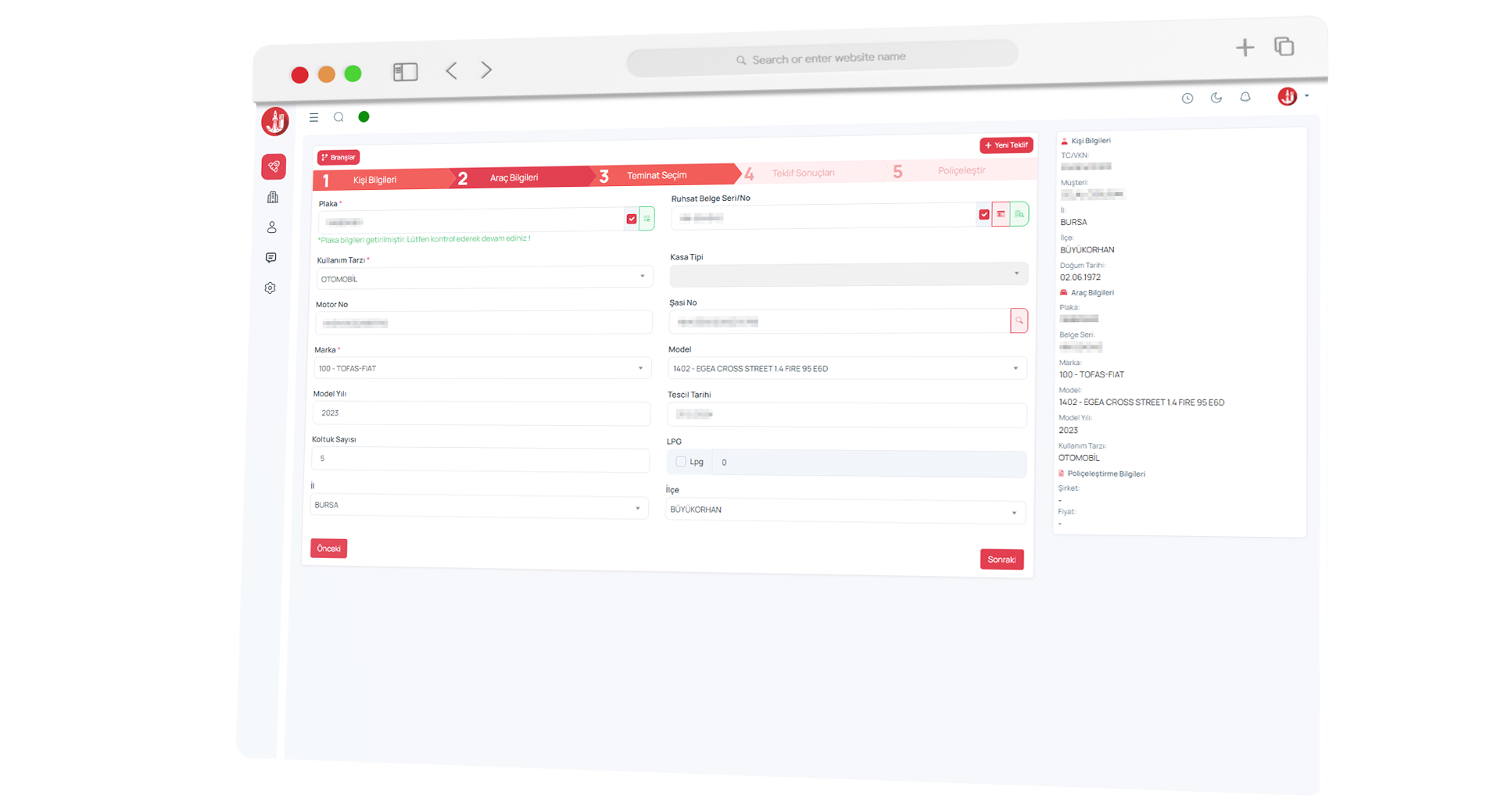 T.C. kimlik numarası sisteme girildiğinde, müşterinin ad, soyad ve doğum tarihi bilgileri merkezi veri tabanından otomatik olarak çekilir. Böylece manuel veri girişi ihtiyacı ortadan kalkar; süreç hızlanır ve hata payı minimuma indirilir.